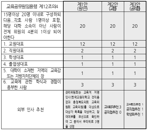 충북대 교수회는 학내 위원 36명을 ▲교원대표 31명 ▲직원대표 4명 ▲학생대표 1명으로, 외부 위원 12명을 ▲총장 추천 1명 ▲교수회 추천 5명 ▲총동문회·기성회·직원회 추천 각 2명으로 구성하자는 입장이다.