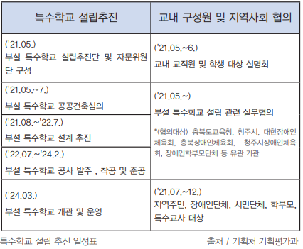 부설 특수학교 설립을 위해 학내에는 ▲총괄위원회 ▲추진위원단 ▲설립 자문위원단이 구성된다. 권민재 처장은 “총괄위원회는 주요한 정책적인 결정을 하는 총괄의 역할을 하기 때문에 주요 보직자들이 구성원이 된다. 그리고 설립 추진과 관련된 실무는 추진위원단에서 진행하게 된다. 자문위원단은 외부 기관의 전문가들을 두어 법률적인 문제뿐 아니라 특수학교 시설, 체육교육, 교육과정 등과 관련된 부분에 대해 자문을 받겠다는 취지가 담긴 기관이다.”라고 추진 체계에 대해 설명했다. 김종우 총장은 “외부에서는 대한장애인체육회, 충청북도장애인체육회, 도청, 시청과 같은 유관단체와 협의를 해야 한다. 내부적으로는 설립추진단, 자문위원단을 구성한다. 앞으로 여러 가지 심의 과정을 거쳐야 하고 설계 공모 과정도 거쳐야 한다.”라며 “공사는 빠르면 내년 여름부터 1년 반 정도 진행될 것이고, 순조롭게 진행이 된다면 2024년 3월에 개교를 하게 될 것이다.”라고 계획을 밝혔다.