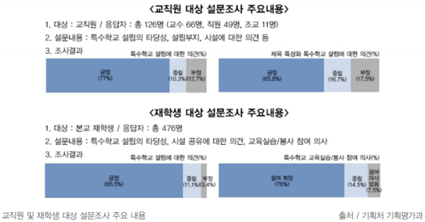 김종우 총장은 “부설 특수학교 설립은 종합교원양성대학으로서 우리 대학의 기능을 확장하는 긍정적인 기능이 있다. 그렇기 때문에 이번 공모를 작년부터 준비해왔다.”라고 밝혔다. 실제 우리학교는 작년 8월부터 특수학교 설립 추진 정책 연구를 진행했다. 비슷한 시기에 특수학교 및 특수학급 학부모와 학생을 대상으로 입학 수요 조사를 실시해 ▲체육 특성화 특수학교의 필요성 ▲특수학교의 적정 규모 ▲입학 의사 및 입학 요인 ▲특수학교 설립 시 고려사항 등에 대한 의견을 물었다. 올해 4월에는 학내 구성원을 대상으로 설문조사를 실시했다. 교직원 126명, 본교 재학생 476명의 응답 결과, 특수학교 설립에 교직원 77%, 학생 85.5%가 찬성했다. 체육 특성화 특수학교 설립에는 교직원 65.8%가 긍정적인 반응을 보였다. 특수학교 교육실습이나 교육봉사에 참여할 의사가 있느냐는 물음에는 학생 78%가 긍정적인 반응을 보였다. 최근에는 대한장애인체육회 사무처와 인근 특수학교인 세종 누리학교를 방문해 자문을 받고 협의하는 등의 과정을 거쳤다.
