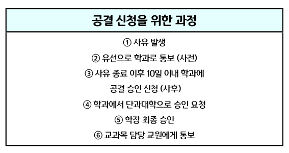 지난 8월 26일부터 18세에서 49세까지의 국민을 대상으로 코로나19 백신 접종이 확대되면서 많은 학생이 2학기 운영 중에 백신을 맞을 예정이다. 이에 백신을 맞거나 격리로 인해 수업 참여가 힘든 학생을 위해 공결 관련 절차 및 방법이 마련되었다. 공결을 신청하기 위한 과정은 다음과 같다. 백신 접종을 위해 공결을 신청하는 학생의 경우에는 원칙적으로 2일간의 공결이 인정되며 공결 승인 신청서, 백신 접종 증명서를 제출해야 한다. 공결 인정 가능 기간 초과 시 진단서를 추가로 첨부해야 한다. 자가격리의 경우 밀접접촉자 보건소 송부 문자 등과 함께 공결 승인 신청서를 제출하면 14일까지 공결로 인정된다. 코로나19 확진 판정을 받은 경우, 수업일수의 최대 1/4까지 공결로 인정되며 공결 승인 신청서와 진단서 등 확진을 판단할 수 있는 증빙서류를 제출해야 한다.