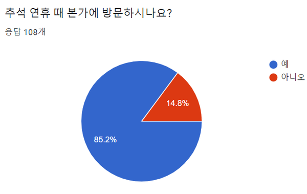한국교원대신문에서는 추석 연휴가 시작하는 19일부터 3일간 사도교육원 입사생 및 인근 자취생을 대상으로 추석 설문조사를 실시했고, 108명이 응답했다. 추석 연휴 때 본가에 방문하시나요?’라는 질문에 참여 인원의 85.2%인 92명의 학생이 ‘예’라고 답변했다. 본가에 방문하지 않는 학우는 16명으로 전체 인원의 14.8%였다. 학생 대부분이 고향에 방문해 가족과 함께 추석을 보냈다.