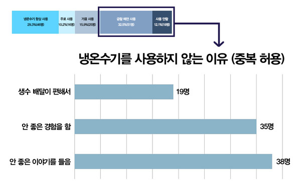 식수 처리 과정에는 큰 문제가 없었지만, 학내 구성원들이 냉온수기를 바라보는 시선은 따갑기만 하다. 10월 25일부터 10월 29일까지 5일간 진행된 학내 냉온수기 인식조사에 의하면 설문 조사에 참여한 157명의 학우 중 51명(32.5%)이 급할 때만 냉온수기를 사용하며, 19명(12.1%)이 냉온수기를 전혀 사용하지 않는다고 답했다. 이어 학내 냉온수기를 사용하는 이유(중복 포함)에 대해 70명이 응답하였다. 38명이 ‘동기, 선배 등으로부터 좋지 않은 이야기를 들었기 때문’이라고 답했으며, 35명이 ‘본인이 좋지 않은 경험을 함’이라고 답했다. 단순히 ‘배달 등을 이용하는 것이 편하기 때문’이라고 답한 학우는 19명에 불가했다.