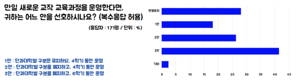 먼저 현행 교직 교육 과정에 대한 전반적인 만족도는 ▲매우 불만족(9.4%) ▲불만족(24%) ▲보통(25.7%) ▲만족(28.7%) ▲매우 만족(12.3%)으로 나타났다. 또한 새 교직 교육 과정의 개편 방향에 대해서는 응답자 절반 이상이 단과대학별 구분을 폐지하는 방안을 선호한다고 답했다. 그 가운데에서도 단과 대학별 구분을 폐지하고 6학기 동안 운영하는 방안(41.5%)을 가장 선호하는 것으로 나타났다. 이 밖에 “정해진 학기가 지나도 수강 신청이 가능했으면 좋겠다”, “교직 분반을 정원에 맞게 증원했으면 좋겠다”라는 추가적인 건의 사항들도 있었다.
