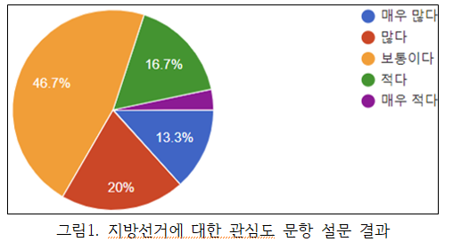 지방선거 관심도에 대한 설문 조사 결과, ‘보통이다’라고 답한 비율이 46.7%로 거의 절반을 차지하였다. 이 중에서 지방선거에 대한 관심도가 낮다고 답한 응답자들의 이유는 크게 두 가지로 나뉘었다. 첫째는, 지방선거가 복잡하고 어려워 진입 장벽이 높다는 것이었다. 예로, 설문 참여자 중 4명은 자신의 선거구에 출마하는 후보가 누구인지, 후보자의 공약이 무엇인지 잘 모른다는 답변을 내놓았다. 둘째는, 대선이나 국회의원 선거보다 지방선거의 중요성이 더 낮다는 인식 때문이었다.