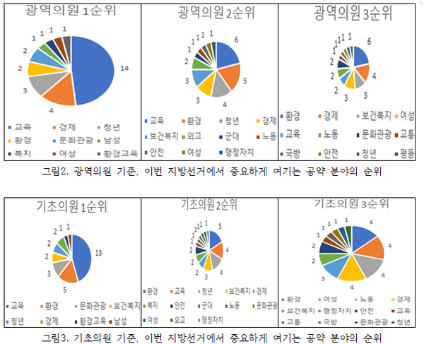 광역의원의 1순위를 제외하고는 우선순위마다 환경공약을 고려하겠다고 응답한 수가 다른 공약에 비해 비교적 높게 나타났다. 이를 통해 지방선거에서 환경공약을 고려하고자 하는 사람이 많음을 알 수 있었다.