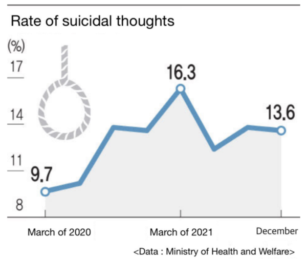 Males in their 30s(22.4%) had the highest rate of suicidal thoughts, followed by females in their 20s(17.3%) and males in their 20s(17.2%). This result shows warning signs were ringing from the mental health of the 2030 generation, who are under higher pressure than before in entrance examination and employment due to COVID-19. Jeong Eun-young, a mental health policy officer at the Ministry of Health and Welfare, emphasized, “As COVID-19 is prolonged, the people’s mental health is deteriorating, such as an increase in suicide rates, so management is necessary.”