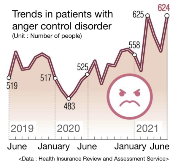 Looking at the monthly increase in patients with IED(Intermittent explosive disorder) through the Health Insurance Review and Assessment Service's health care big data opening system, the number of patients increased by more than 100 from 519 in June 2019 before COVID-19 to 624 in June 2021. This shows that patients diagnosed with depression and patients with anger control disorder increased significantly through the