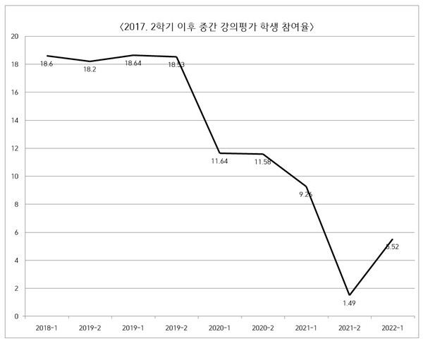 중간 강의평가는 2017년 2학기에 처음 도입된 이후 계속 시행 중이나, 참여율이 점점 감소하는 추세이다. 특히 2019학년도 2학기까지 18% 전후의 참여율을 유지하였으나, 2020학년도 1학기 이후 참여율이 급격히 떨어졌다. 코로나19로 인한 비대면 수업 운영으로 학과 생활에 대한 학생들의 관심도가 하락하면서 발생한 결과로 추정된다. 2021년 2학기에는 최저점(1.49%)을 찍었고, 2022학년도에 약 4% 증가하였으나 여전히 낮은 수준의 참여율을 보이고 있다. 이는 약 95%의 참여율을 보이는 기말 강의평가와는 대조되는 결과이다.