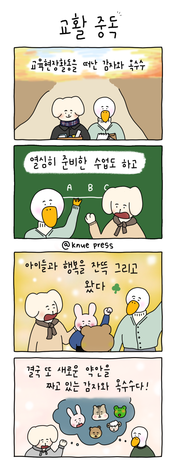 신희수(초등교육˙22) 학우 한국교원대신문 knuepress@naver.com 다른기사 보기 저작권자 © 한국교원대신문 무단전재 및 재배포 금지 당신만 안 본 뉴스 [513호/종합탑] 다가오는 제37대 총학생회장단 선거, ‘울림’ 선본 단독 출마 [513호/기획] 코스피 지수 사상 첫 4,000 돌파! 주식 열풍에 대해 알아보다 [513호/보도] 총장 공약 이행 평가 TF, 어떻게 진행되었나? [513호/사무사] 실패를 대하는 태도, 다시 점검해 볼 때 [513호/사설] AI와의 조우, 대학이 해야 할 고민 [513호/기획] 다가서다⑯ - 소멸의 위기에 놓인, 인구감소지역 학생에게 다가서다 [513호/네컷만화] 수많은 공연! [513호/종합탑] 다가오는 제37대 총학생회장단 선거, ‘울림’ 선본 단독 출마 댓글삭제 삭제한 댓글은 다시 복구할 수 없습니다. 그래도 삭제하시겠습니까? 비밀번호 닫기 기사 댓글 0 댓글 접기 댓글입력 권한이 없습니다. 댓글 내용입력 비회원 로그인 이름 비밀번호 댓글 내용입력 댓글쓰기 계정을 선택하시면 로그인·계정인증을 통해 댓글을 남기실 수 있습니다. 회원 로그인 이름 비밀번호 자동등록방지 로그인 옵션 창닫기 주요기사 [513호/사회탑] 2025 APEC 정상회의, 지속가능한 미래 위한 협력 논의 [513호/종합탑] 다가오는 제37대 총학생회장단 선거, ‘울림’ 선본 단독 출마 [513호/교육탑] 공교육 속에 도입된 IB, 아직 제도적 과제 남아있어 [513호/보도탑] 제37대 총학생회장단 선거, 진행 과정의 변화 [512호/보도탑] 복수전공, 10명 중 4.6명꼴로 중도 포기 … 그 원인과 대책은? [512호/사회탑] 기대와 우려 속 78년 만에 폐지된 검찰청