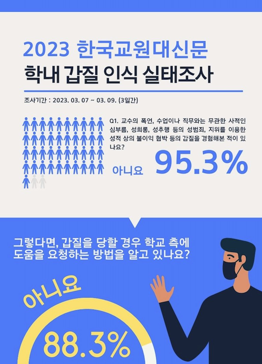 한편 A 씨와 같은 상황에 처하더라도 그에 대한 대처 방안을 알고 있는 학우는 얼마 없는 것으로 드러났다. 한국교원대신문에서 3월 6일부터 9일까지 3일간 진행한 ‘학내 갑질 인식 실태 조사’에서 “갑질을 당할 경우, 학교 측에 도움을 요청하는 방법을 알고 있나요?”라는 질문에 전체 응답자 43명 중 88.3%(38명)의 학우가 “아니요”라고 응답했다.