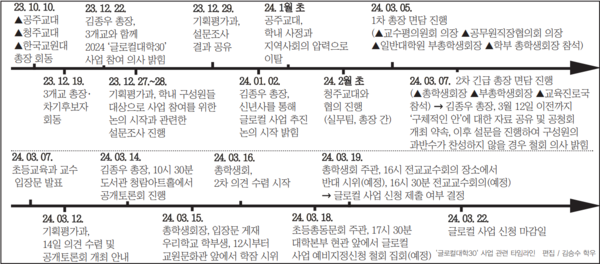 김종우 총장이 청주교대, 공주교대 총장과 첫 회동을 했던 것은 작년 10월 10일, 학내에 글로컬 사업 추진을 검토하고 있다고 공식적으로 밝힌 것은 12월 22일이었다. 그리고 학생들에게 글로컬 사업과 관련된 자세한 정보가 공개된 것은 글로컬 사업 신청 마감일로부터 일주일 남짓 이전인 3월 14일 공개토론회에서였다. 이 두 시점 사이에는 약 3개월의 시간적 공백이 있었다. 이 기간 동안 대학본부는 총학생회 측의 정보 공유 및 공청회 개최 요구에도, 한국교원대신문의 취재 및 인터뷰 요청에도 ‘구체적인 안’이 없다고 일관해왔다.