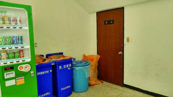 휴게공간에 청소용품과 기계 설비가 함께 있는 곳도 많았다. 응용과학관에는 휴지 박스와 각종 기계설비, 교양학관에는 청소도구와 세제용품, 융합교육관에는 CCTV를 비롯한 기기가 휴게실 한쪽을 차지하고 있었다. 교양학관의 B씨는 “이곳은 휴게실이 넓어 괜찮다”고 말했다. 한편 융합과학관 청소노동자 C씨는 “쉬고 있을 때 기계 담당하시는 아저씨가 들어오기도 하고, 기계가 함께 있는 게 조금 불편한 면이 있다”고 설명했다.