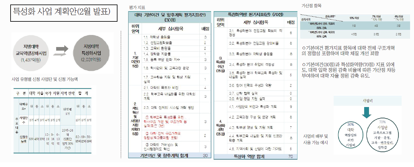 또한 교육부는 지난 2월 지방대학 특성화 사업(이하 특성화 사업) 시행 계획안을 발표했다. 특성화 사업이란 비교우위에 있는 분야에의 지원을 통해 지방대학의 경쟁력을 강화하고자 하는 사업으로, 과거 지방대학 교육역량강화 사업을 개편한 것이다. 이 때 ▲사업 평가지표에 ‘대학 전체 구조개혁의 정합성(2점)’ ▲가산점 항목에 ‘입학정원 감축 비율 여부(10%이상 5점, 7%~10% 4점, 4%~7% 3점)’를 포함하여, 학령인구 감소에 대비한 정원 감축과 사회적 변화를 수용한 학사 구조 개편 등 대학의 체질 개선을 꾀한다. 구조개혁과 재정지원 사업을 연계하여 대학 자체 정원 감축을 유도하는 것이다.