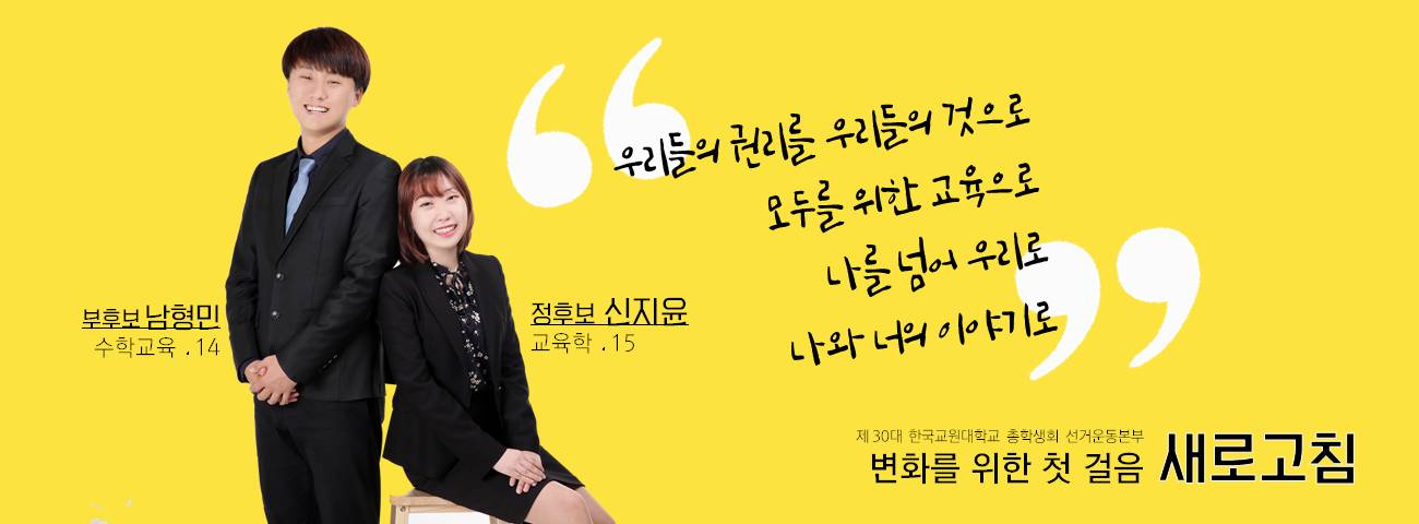 On November 21, the 30th student president and vice president were elected. Sin Ji-yoon, a presidential candidate majoring in Education, and Nam Hyung-min, a vice presidential candidate majoring in Mathematics Education, was the sole candidate team for the election. Among enrolled 2,314 KNUE students, 50.73 percent voted for the election, and among the voters, 95.99 percent cast a ballot in favor of the candidates.