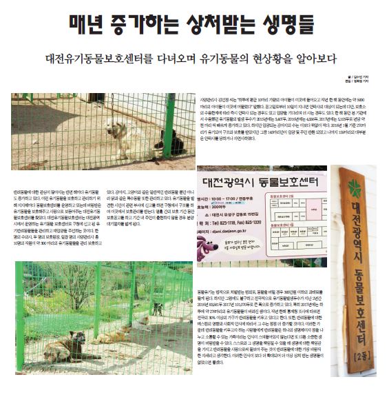 반려동물에 대한 관심이 많아지는 반면 해마다 유기동물도 증가하고 있다. 이런 유기동물을 보호하고 관리하기 위해 지자체마다 동물보호센터를 운영하고 있는데 버림받은 유기동물을 보호해주고 사랑으로 보듬어주는 대전유기동물보호센터를 찾았다. 대전유기동물보호센터는 대전광역시에서 운영하는 유기동물 보호센터로 구청에 신고 된 유기반려동물들을 관리하고 재입양을 주선하는 곳이다. 한 명의 수의사, 두 명의 보호팀장, 일곱 명의 사양관리사 총 10명의 직원이 약 300 마리의 유기동물들을 관리 보호하고 있다. 강아지, 고양이와 같은 일반적인 반려동물 뿐만 아니라 닭과 같은 특수동물 또한 관리하고 있다. 유기동물을 발견한 시민이 관련 부서에 신고를 하면 구청에서 구조를 하여 이곳에서 보호관리를 받는다. 열흘 간의 보호 기간 동안 보호공고를 하고 기간 내 주인이 출현하지 않을 경우 분양대기절차를 밟게 된다.