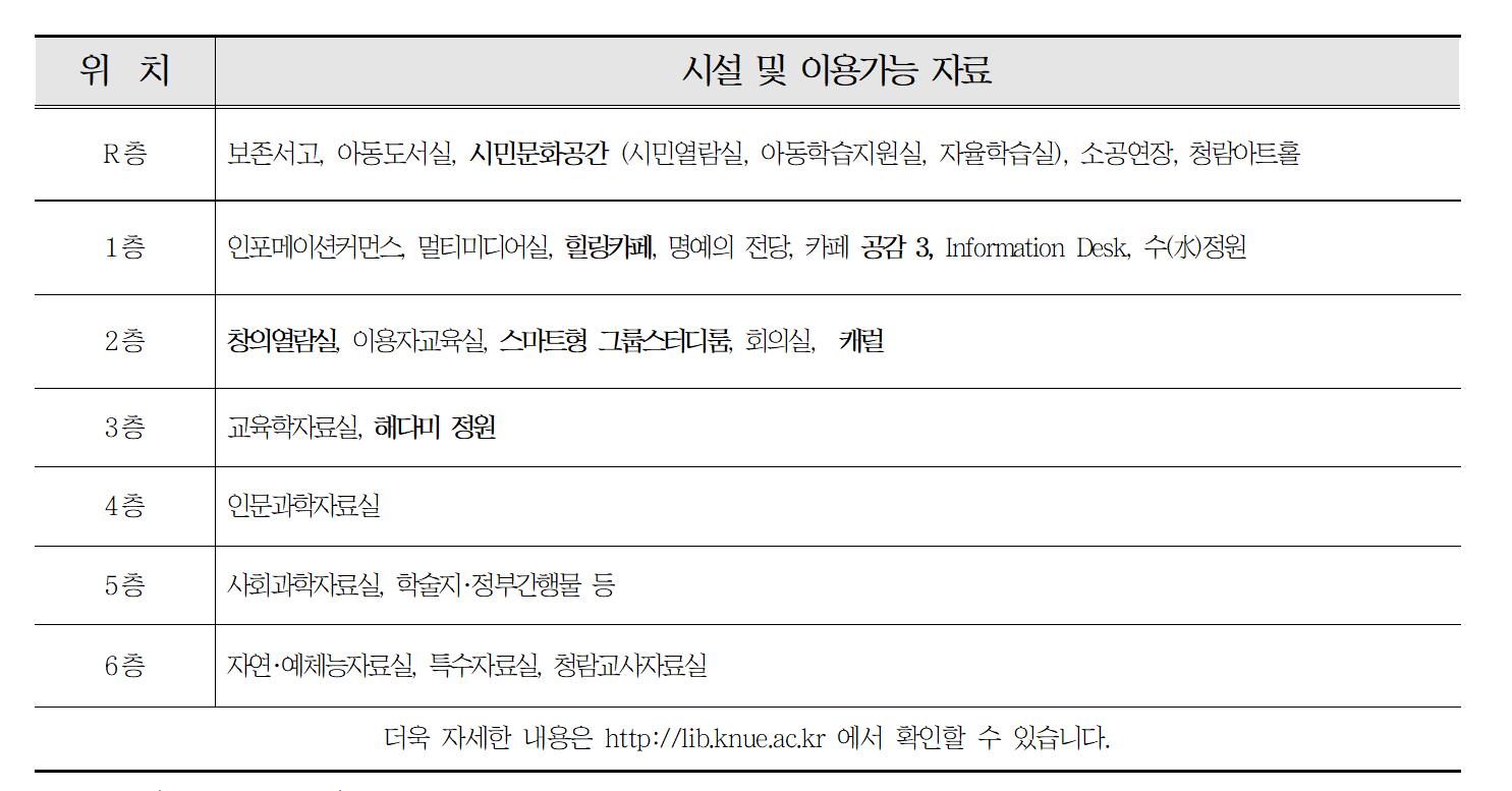 1층에는 힐링카페, information commons, 멀티미디어실, 카페 공감 3이 개설되었다. 힐링카페는 휴게와 독서, 만남과 대화가 가능한 정서형 소통 공간으로 이루어졌고, information commons는 온라인 정보검색, 전자정보, 국회도서관원문서비스, 동영상강의 등 문서작성, 출력·복사·스캔 등 서비스 가능한 OA룸 등이 구성되어 있다. 멀티미디어실은 다양한 문화 컨텐츠 자료를 대출 및 열람할 수 있는 공간과 1인, 2인 ~ 12인 까지 사용가능한 극장식 자료실이 있다. 카페(공감 3)은 야외 데크가 있는 유럽식 카페(소비조합 운영)이며, 수(水)정원은 물이 흐르는 정원으로 사색과 담소를 나눌 수 있는 공간이다.