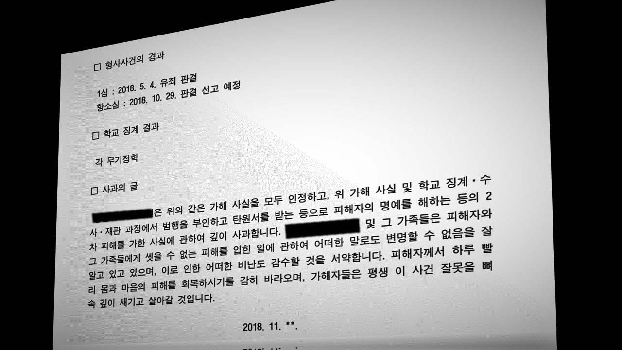 2018년 11월 27일, 청람광장에 사과문구 하나가 게시되었다. 남학우 A와 B가 본인들이 한 여학우를 ▲성추행한 사실(가해 사실), ▲형사사건의 경과, ▲학교 징계 결과, ▲사과의 글등을 포함한 사과문구를 게재하였다. 사과문구의 가해 사실란에는 “2017 .6. 15. 새벽 피해자의 휴대전화를 빼앗은 뒤 피해자의 어깨를 밀어 눕히고 피해자로 하여금 반항하지 못하게 하고, 피해자를 추행하고 피해자의 하의를 끌어내림으로써, 합동하여 피해자를 강제로 추행하였습니다.”등의 대략적인 가해사실이 기술되어있다. 사과의 글에서는 “A과 B은 이와 같은 가해 사실을 모두 인정하고, 위 가해 사실 및 학교의 징계·수사·재판 과정에서 범행을 부인하고 탄원서를 받는 등으로 피해자의 명예를 해하는 등의 2차 피해를 가한 사실에 관하여 깊이 사과합니다.”라고 사과의 뜻을 밝혔다. 덧붙여 “피해자께서 하루 빨리 몸과 마음의 피해를 회복하시기를 감히 바라오며, 가해자들은 평생 이 사건 잘못을 뼈 속 깊이 새기고 살아갈 것입니다.”고 하며 사과문구를 끝마쳤다.