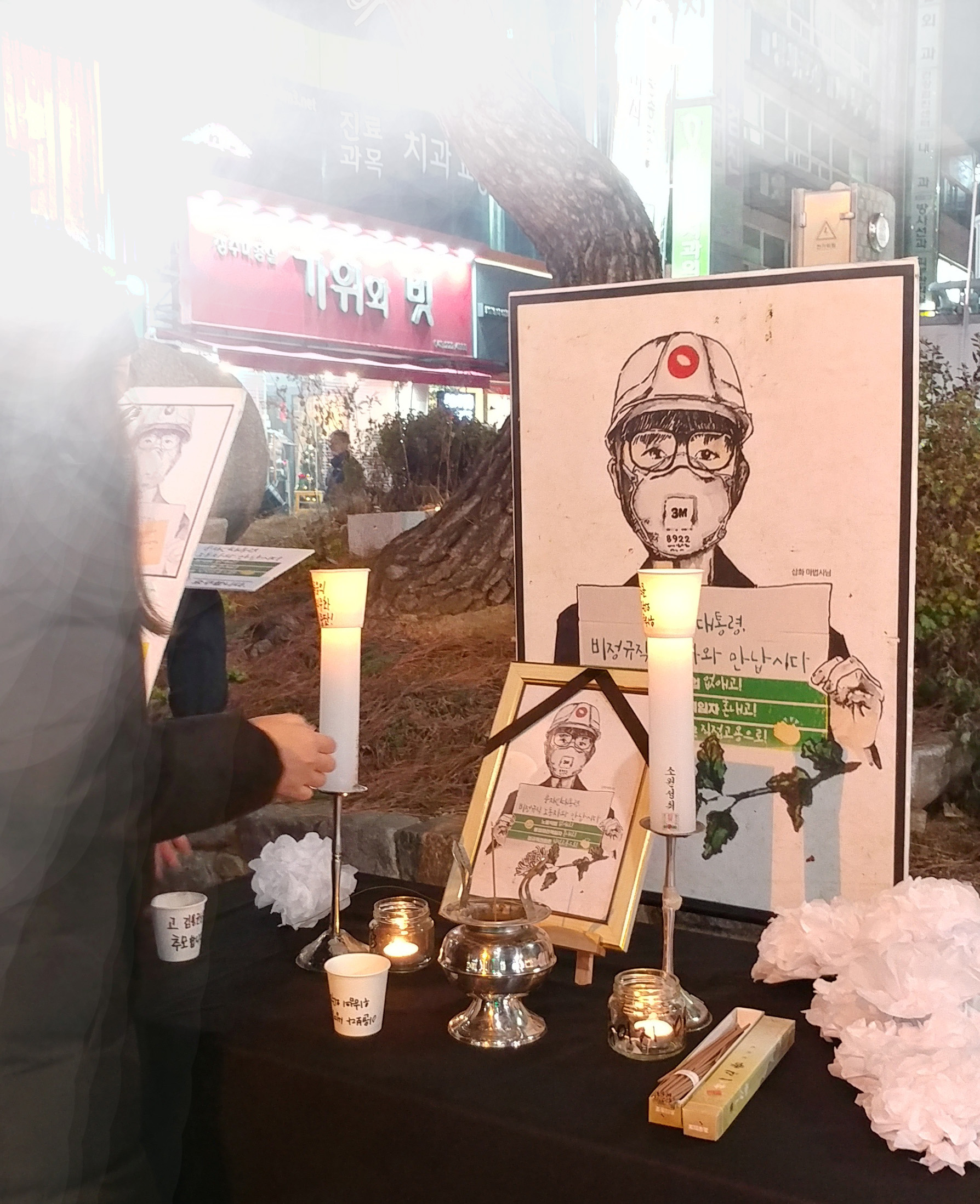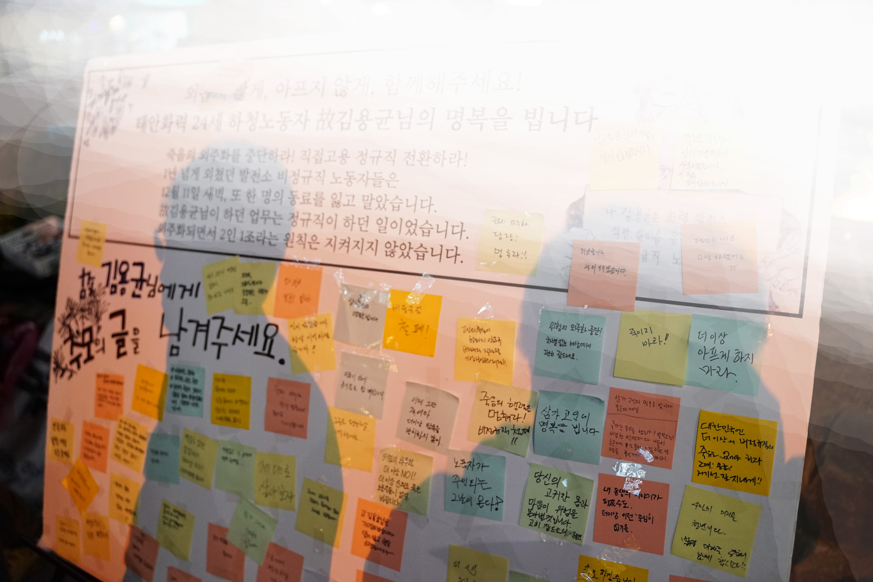 지난 12월 11일 오전 3시 20분경, 충남 태안화력발전소에서 비정규직으로 근무하던 故김용균(24) 씨는 설비점검을 위한 순찰 중이었다. 발전소 내 컨베이어벨트 구역은 조명이 설치되지 않아 어두웠다. 하청업체 노동자들은 여러 차례 조명 설치를 요구했으나, 원청인 한국서부발전은 이를 받아들이지 않았다. 기본 장비인 헤드랜턴조차 지급되지 않았다. 김씨는 대신 휴대폰 플래시를 켜고 기계를 들여다보다가, 컨베이어벨트에 몸이 끼여 사망했다. 기계에는 안전 스위치가 있어, 2인1조로 일하다가 한 사람이 몸이 끼이면 다른 사람이 줄을 당겨 기계를 멈출 수 있었다. 그러나 김씨는 혼자였고, 사망한지 4시간이나 지난 후에야 동료들에 의해 발견되었다. 전날까지 함께 밥을 먹고 일하던 동료들이 시신을 수습했다. 12월 20일 청주에서 열린 추모문화제에서 김씨의 동료는 “벨트에 온몸이 갈기갈기 찢겨 싸늘하게 식어버린 용균이를 부여잡고 인공호흡이라도 해보려고 용균이의 얼굴을 잡아보자 두 손에 아무것도 만져지지 않았다는 모 대리님의 말씀을 듣고 가슴이 미어지는 줄 알았다. 그렇게 동료들이 용균이를 살리고자 발버둥치고 있을 때 한국서부발전은 하청업체 정비원 두 분을 급히 불러 정비를 시작하였고, 소방관들이 용균이를 수습하고 있는 와중에도 정비를 하여 무려 80분간이나 벨트를 가동했다고 한다. 그 이야기를 듣고 귀를 의심했다. 자기 자식이, 자기 동생이, 자기 조카가 벨트에 휘말려 싸늘한 주검으로 발견되어도 벨트를 과연 기동했을까.”라며 참담한 심정을 전했다. 노동자들은 이 사고가 ‘죽음의 외주화’ 때문이라고 입을 모았다.