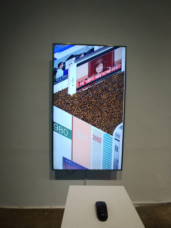 This section analyzes post-Internet art as a political participant, as well as the problem of Internetcensorship. This artwork expresses political movements that people have participated in with flat mobile devices by pixel. Many social issues are expressed in the pixels. From Gwangju 5.18 Democratic Movement in the1980s to protests against the biased investigation in Gwanghwamun can be seen. At the end of the screen, there are all the years in the thickness of the cell phone indicating that social issues have been made from small cell phones. Many people hesitate to visit the Biennale due to the difficulty of understanding. Considering this, Gwangju Biennale runs docent in every hour and provides booklets containing detailed descriptions of the works. Also, because the works represent the realities of the world, visitors can understand the world deeply. As a global citizen, it would be good to visit the Biennale.