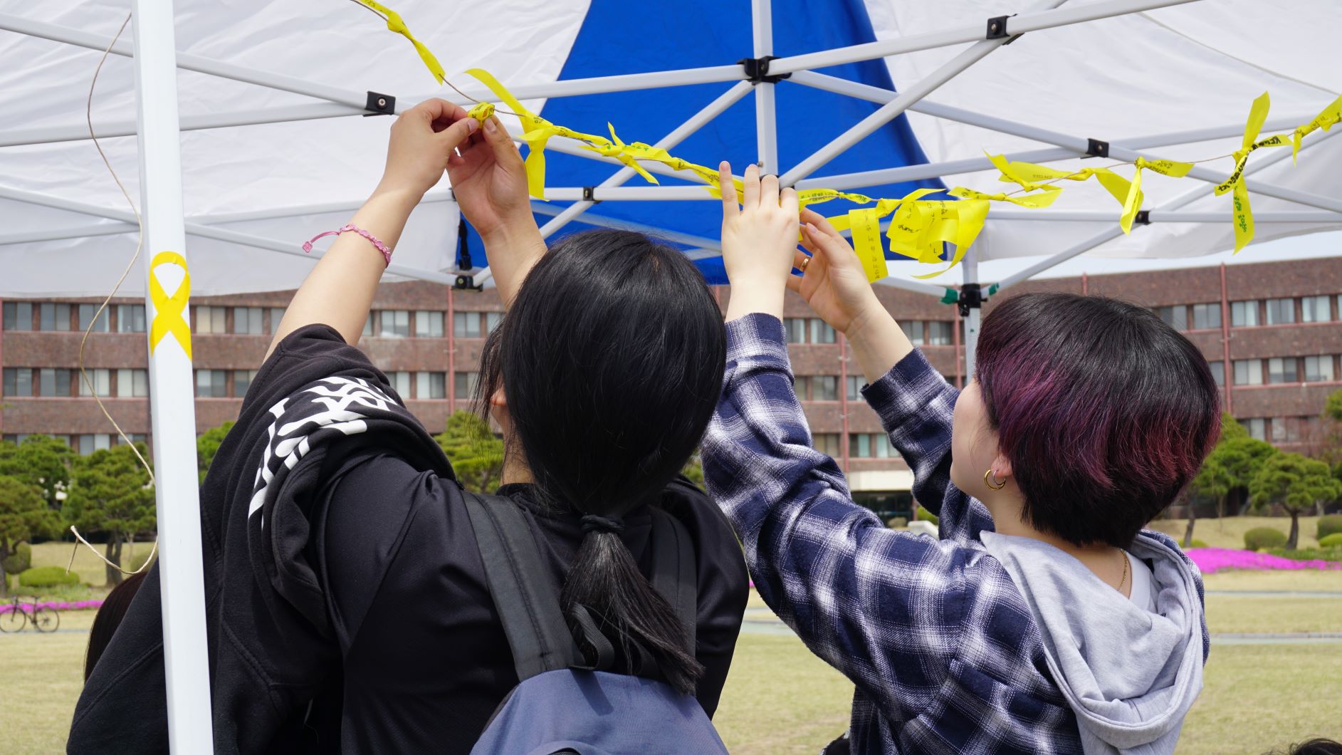 우리학교 비상대책위원회에서는 4월 16일 오전 10시부터 오후 5시까지 잔디밭 외톨이 나무 앞에서 세월호 5주기 추모 부스를 운영하였다. 부스는 리본 달기와 포스트잇 쓰기로 진행되었으며 걸린 리본들은 4.16연대에 전달된다. 포스트잇에 쓰인 문구에서 세월호 희생자들을 진심으로 추모하고 함께 슬퍼하는 우리학교 학우들의 마음을 볼 수 있었다. 행사에 참여한 김산하(초등교육·18) 학우는 “종이에 ‘잊지 않고 항상 기억하겠습니다.’라고 적었다. 기억하겠다는 간단한 말이었지만 사실 이런 부스 행사가 있기 전까지 망각하고 있다는 느낌이 들었다. 그래도 학생회에서 이렇게 부스 운영과 이런 행사를 해주셔서 잊지 않고 기억할 수 있어 좋았다.”라고 이번 추모 행사에 대한 의견을 밝혔다.
