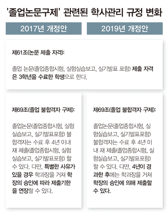 지난 2017년 학사관리과는 학사관리 규정 중 졸업논문구제와 관련된 내용을 개정했다. 졸업논문 제출 자격과 졸업논문 불합격자 구제 범위를 확대하기 위해서였다. 2017년 규정 개정을 통해 학사관리 규정에는 “졸업논문 제출 자격은 3학년을 수료한 학생으로 한다”는 내용이 담겼고 졸업논문 제출 자격자가 8학기 이상 이수자에서 7학기 이상 이수자로 변경되었다. 또한 “수료 후 4년 이내에 졸업논문을 재제출 할 수 있다. 다만, 특별한 사유가 있을 경우 학과장을 거쳐 학장의 승인에 따라 제출 기간을 연장할 수 있다”는 내용도 담겼다. 졸업논문 불합격자가 졸업논문을 제출할 수 있는 기회를 늘린 것이다.