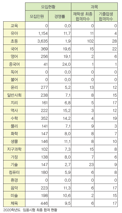 2020년도 임용시험 최종 합격 현황(자료출처: 입학인재관리과)