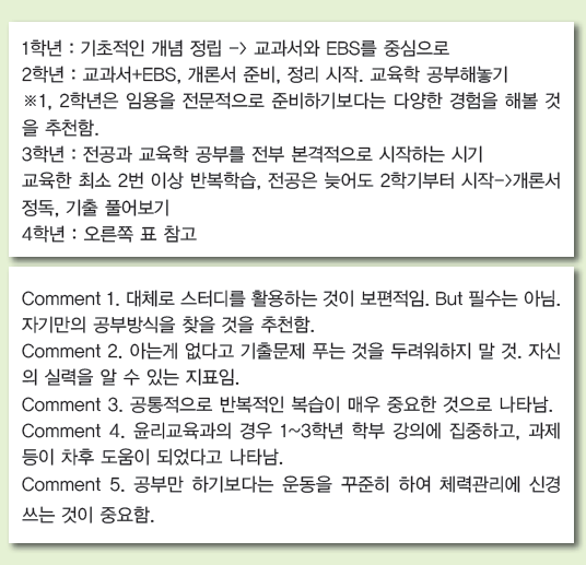 6. 1, 2학년 때, 임용시험을 위해서 무엇을 준비해두면 도움이 될지 궁금합니다. 특히, 1, 2학년 때 듣는 강의가 임용시험에 직접적으로 연관이 되는지, 1, 2학년 강의 서적을 전부 사셨는지 궁금합니다.