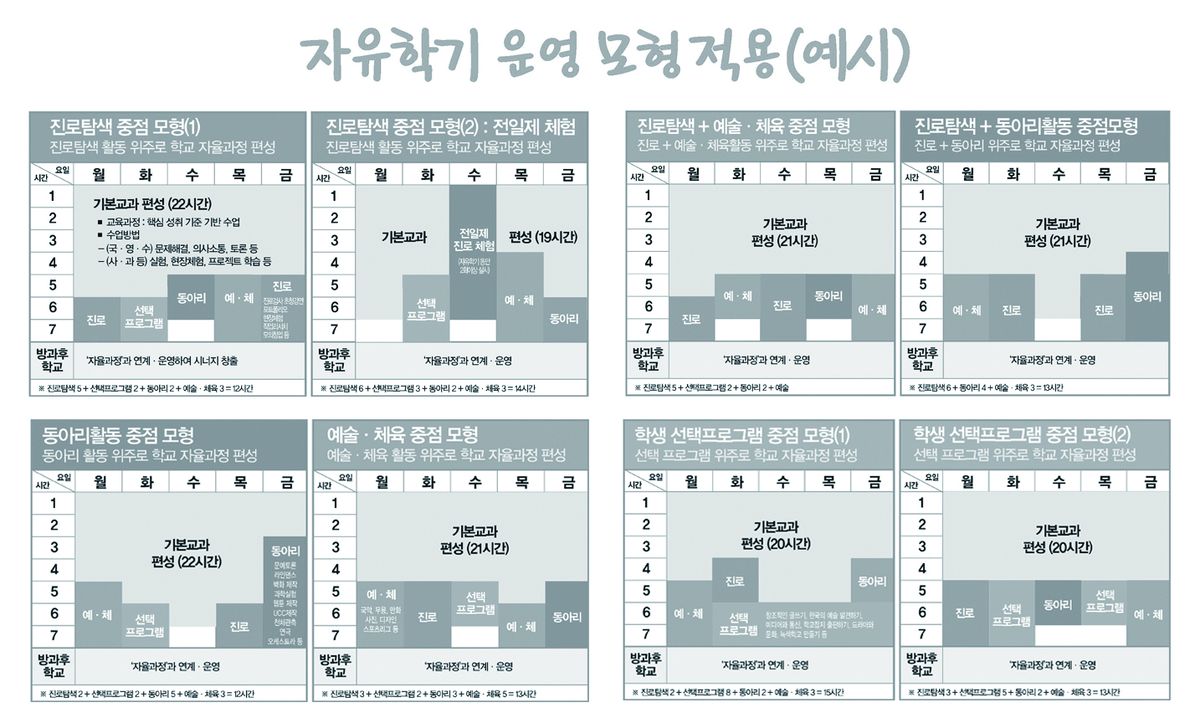 이러한 자유학기제의 목적은 학생들이 행복한 학교생활 속에서 스스로 꿈과 끼를 찾고 미래사회가 요구하는 역량을 배양하는 것이다. 이를 위해 자유학기제는 여러 가지 편성 및 운영 방안을 이용한다. 자유학기제 실시 학교는 ▲학생의 체계적인 진로탐색 기회 확대 ▲체험․참여형 프로그램 강화 ▲학생의 참여와 활동을 중심으로 하는 교수․학습방법의 다양화 ▲유연한 교육과정 편성․운영 ▲자유학기제 취지에 맞는 평가방법 마련의 다섯 가지 방법을 참고한다. 각 학교들은 이를 가이드라인으로 삼아 다양한 교육과정을 구성․운영하고 시․도 교육청으로부터 애로사항에 대해 지원받는 방식으로 운영한다.