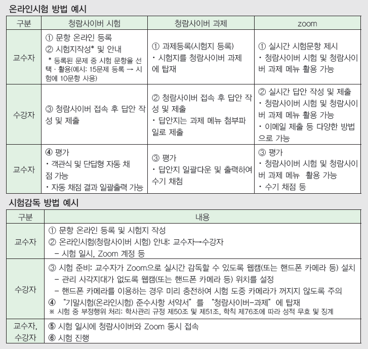 온라인 시험의 경우, 청람사이버 시험, 청람사이버 과제 또는 Zoom으로 시험을 진행할 수 있다. Zoom을 이용해 시험을 볼 경우, ▲교수자는 실시간으로 시험 문항을 제시하고 ▲수강자는 실시간으로 답안을 작성하여 제출하는 형태이다. 온라인 시험 방법 예시의 자세한 방법은 다음과 같다.