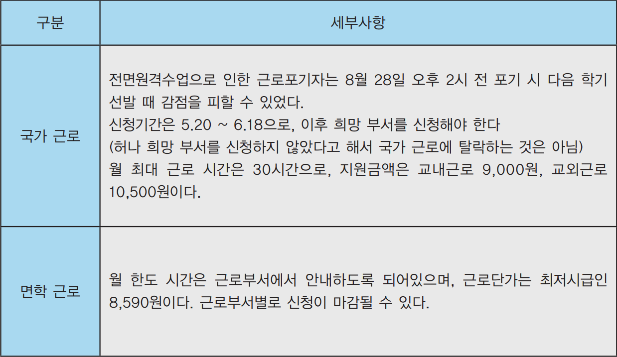 비대면 수업 및 희망 입사 상황에서 2학기 국가 및 면학 근로는 정상적으로 운영된다. 근로 기간은 9. 1(화) ~ 12.11(금)이다.