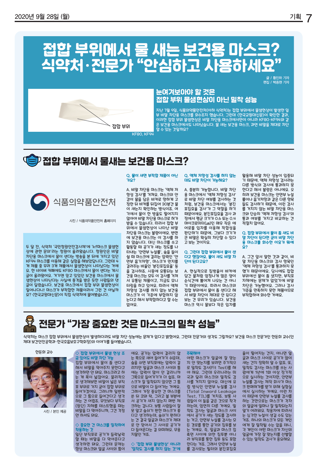 보건용 마스크에서 접합 부위 물샘현상이 일어나다니! 마스크가 부적합한 제품이라서 그런 건 아닐까요? <한국교원대신문>이 직접 식약처에 물어봤습니다.