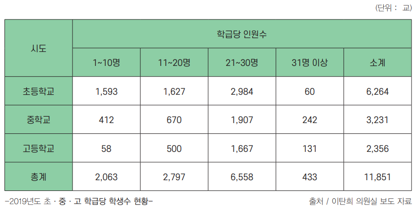 모든 학생은 지역 및 학교 특성과 상관없이 동등한 환경에서 양질의 교육을 받을 수 있어야 한다. 현재 코로나19로 인해 학교마다 등교일수 차이가 발생하며, 학생들의 동등한 교육을 받을 권리가 제대로 보장되지 않고 있다. 이런 상황 속에서 열악한 학교의 등교 수업 가능성을 확보하고, 학습 공백을 메워 학교 간 학습 기회의 격차를 극복하려는 노력이 필요하다. 그 노력의 핵심으로, 학급당 학생 수를 줄여야 한다는 목소리가 교육계를 비롯한 사회 곳곳에서 커지고 있는 것이다.