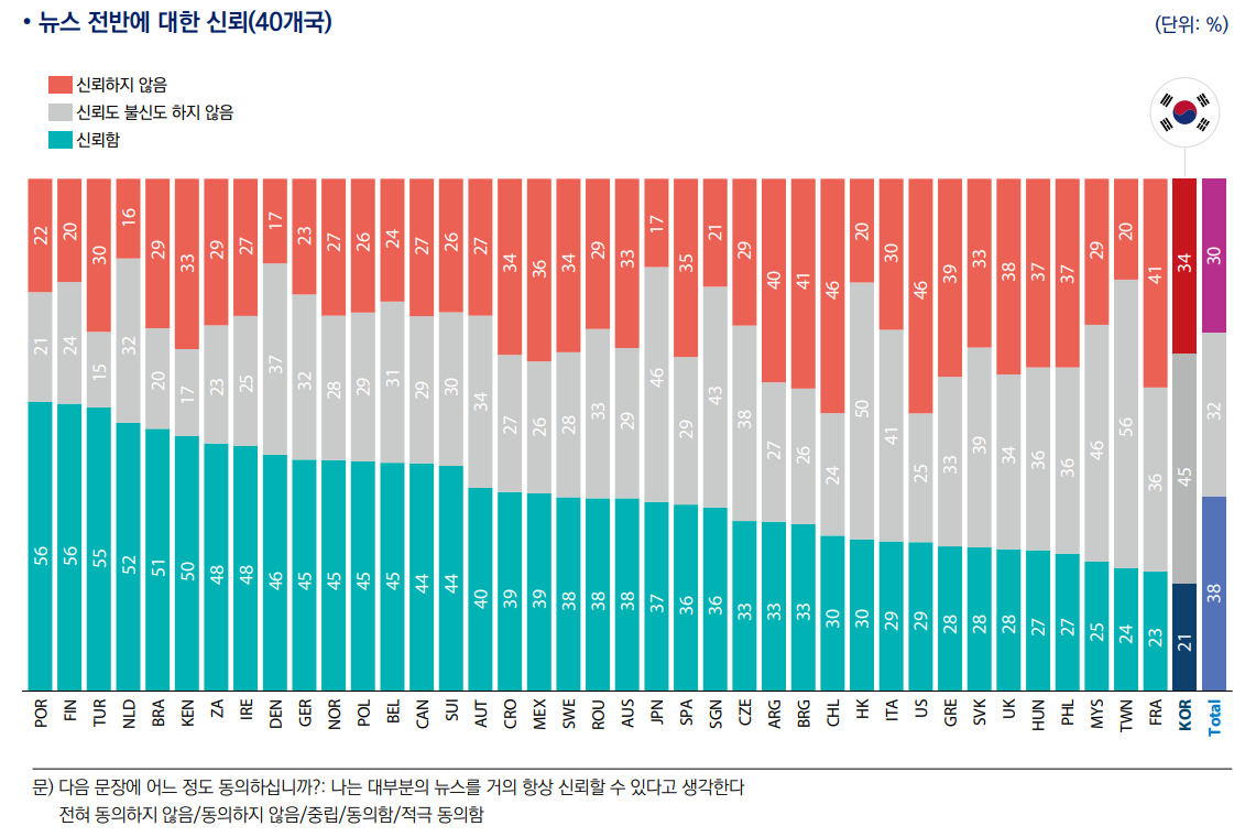 조사대상 40개국 중 최하위를 기록한 한국의 뉴스 신뢰도, 계속해서 등장하는 윤리강령 제정의 필요성이나 언론사에 대한 징벌적 손해배상제 도입 논란 등은 현재 한국의 언론계의 자정과 개혁이 필요함을 시사한다. 하지만 언론만 자정한다고 해서 한국 언론이 지닌 문제가 해결되지는 않는다. ‘언론에 대한 징벌적 손해배상제 타당한가 긴급 토론회’에서 이동훈 한국기자협회장은 “언론 개혁은 ▲언론계의 자정 ▲법과 제도의 개선 ▲시민 대응 지원 등 삼박자가 이뤄져야 완성될 수 있다”고 전했다. ‘디지털뉴스리포트’에도 나타났듯이 낮은 뉴스 신뢰도의 배경에는 미디어 환경의 변화, 그리고 언론의 편파적인 보도뿐만 아니라 대중들의 편파적인 뉴스 이용도 함께 있기 때문이다. 건강하고 윤리적인 한국 언론을 살리기 위해 언론사들과 기자들의 노력뿐만 아니라 대중들의 올바른 뉴스 이용이 함께 이루어질 수 있길 꿈꿔본다.