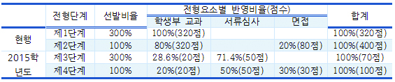 수시전형은 제1단계에서 모집인원의 3배수를 뽑고, 이들에 대해 제2단계를 행하는 방식으로 진행된다. 기존에는 제1단계에서 학생부성적만을 반영해 320점 만점으로 결정했다. 또한 제2단계에서는 80점 만점의 면접을 포함 총 400점 만점이었다. 하지만 2015학년도부터는 제1단계는 20점 만점의 학생부 성적(28.6%)과 50점 만점의 서류심사(71.4%) 등 총 70점 만점으로, 학생부 반영 비율이 낮아졌다. 또한 제2단계에서 면접의 비율도 기존 20% 반영에서 30% 반영으로 높아져, 전체적으로 학생부 성적 반영 비율이 낮아졌다. 이에 대해 장 주무관은 “학생부 반영비율이 낮아짐에 따라 서류심사에서 높은 점수를 받은 학생이 유리하다”며 “따라서 서류심사에서 당락이 판가름 날 것”이라 말했다.