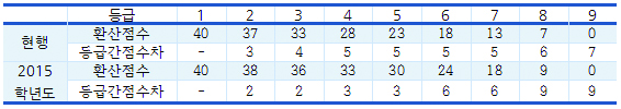 아울러 교과성적 반영점수 산출방법도 기존 ‘[(이수단위x등급환산점수)의 합/이수단위의 합]x20/40’에서 ‘[(이수단위x등급환산점수)의 합/이수단위의 합]x20/40’으로 변경된다. 표 2에서 확인할 수 있듯이, 2015년 등급별 환산점수는 1등급과 9등급을 제외한 모든 등급에 있어 소폭 상승했다.
