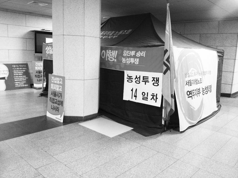 지난 17일 서울시청역에서 서울지하철 노동조합 역무지부가 ‘성실교섭 및 노사정 협약 이행’을 촉구하며 14일 째 농성투쟁을 벌이고 있다.