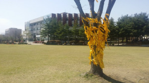 Last year, on April 16th, there was a tragic and sorrowful Sewol ferry accident. To commemorate this tragedy, the student union had a ribbon campaign from April 15th to 17th in Cheongram Square. Despite the harsh rain as well as the mid-term exams, many students, faculties and even residents of this area participated in the ceremony and hung the ribbon on the “Minju Tree” which stands alone in the middle of Cheongram Square. Those ribbons were made by the members of student union. Around 450 people participated in the three-day ribbon campaign. On behalf of everyone in KNUE, the ribbons were sent to the victim’s families.