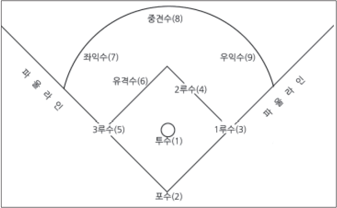 야구경기장은 대강 이런 모습으로 생겼다. 괄호 안은 포지션넘버이다. 선수 개인의 등번호와는 상관이 없다. ‘야구는 투수놀음’이라는 말이 있듯 투수(Pitcher)는 야구에서 가장 중요한 포지션이라 해도 과언이 아니다. 적절한 구종과 속도로 공을 던져야 한다. 실수할 경우 타자는 금방 알아차리기 때문이다. 포수(Catcher)는 앉아서 투수의 공을 받는 사람인데, 투수와 사인을 주고받는 장면을 흔히 보았을 것이다. 언뜻 가장 할 일 없는 포지션으로 보일 수 있지만, 투수가 던지는 공을 정하는 것이 포수다. 즉 투수를 컨트롤하고 경기의 흐름을 좌우하는 포지션인 것이다. 투수와 포수를 묶어 배터리(battery)라고 표현한다.