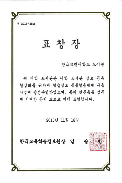 지난달 16일 우리학교는 2015년 전국대학도서관대회에서 학술정보 공유·유통 부문 우수기관상을 수상했다. 전국대학도서관대회는 교육부에서 주최하고 한국교육학술정보원(KERIS)에서 주관하는 대회로 매년 전국 대학을 대상으로 학술정보 공유·유통 사업 부문별 우수 대학을 선정해 표창을 수여한다. 학술정보 공유·유통 사업은 ▲종합목록 ▲상호대차 ▲원문유통으로 나뉘며 우리학교가 수상한 원문유통 부문은 기관 안에서 생산된 논문 등을 사용자가 이용하기 편리하게 서비스를 제공했는지 여부를 심사한 부분이었다.