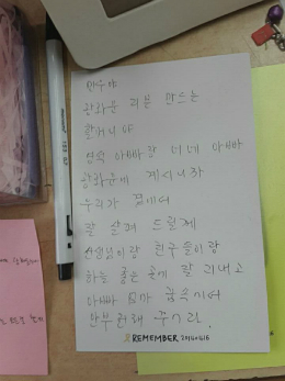 김 군 아버지: 그렇다. 아주 다르다. 교실은 아이들이 숨 쉬고 바닥을 밟으며 걸어 다녔던 현장이다. 작은 흔적 하나 간절하고 아까운 마당에 ‘기억 교실’은 너무 소중한 공간이다. 교실 어디 더 손 때 묻은 데 없나 찾고 싶고···.