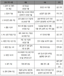 이번 새터 예산 사용내역이 감사에서 지적 받은 사항은 총 10가지(표 참고)였으며, 그 중 쟁점은 ▲새터복 예산으로 대동제 실무단의 의복을 비롯한 총학의 단체복을 구입한 점 ▲재학생 특강 관련자들의 점심 식비로 1인당 5만원을 지출한 점 ▲상비약 품목에 술 깨는 약이 포함된 점 등이었다.