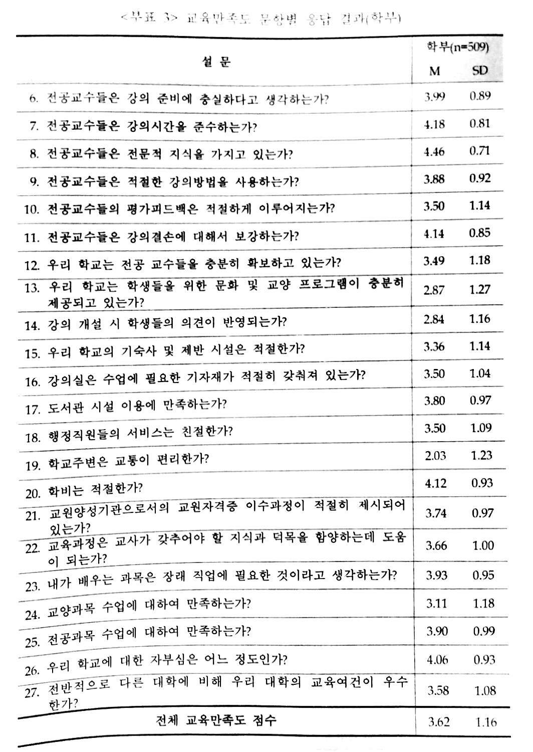 하지만 학부생, 일반대학원생, 교육대학원생 모두 ‘학교주변의 교통의 편리성’ 항목에는 가장 낮은 만족도를 보였는데, 2011년도에 실시된 자체평가에서도 동일한 항목에 대해 재학생의 만족도가 가장 낮았다(1.9점). 2011년도 자체평가 보고서에서는 ‘전반적인 교육만족도 제고를 위해서는 학부생의 교통 편의를 높이기 위한 노력이 중요하다’고 평가했다.