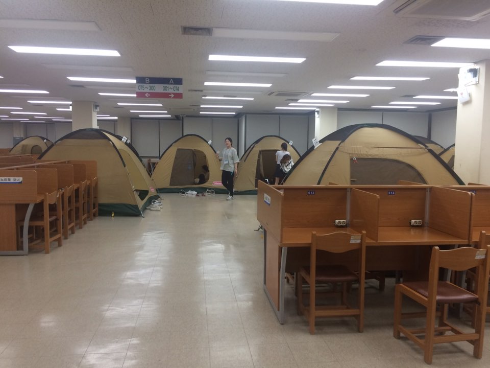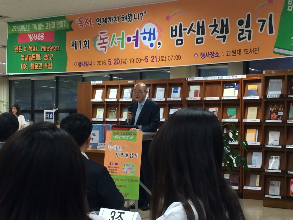 “All Night Reading” is a library superintending program which was planned to give students unforgettable experiences of reading in their school days. The program was implemented by the group under University Library, “Making a reading KNUE student.” The group firstly started with recruiting reading club members in 2010 in order to raise the basic and general knowledge of KNUE students through reading books. By now, it has been expanding its area via programs such as “Selecting Recommended Books,” “Writing a Book Review,” and “Communication with an Author.” And in the present, they keep their works with a new program, “All Night Reading.” In the program, students read books in tents all night long. In addition to reading, many games such as Bingo, Golden Bell, and OX Quiz are scheduled to be conducted in intervals. Because of these various programs, students could focus on reading without boredom.