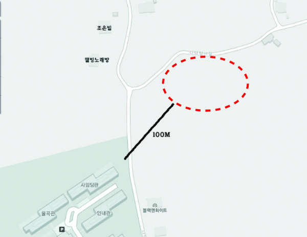 ▲ 예상 공장 부지. 사임당관과 100m 가량 떨어져있다.사도교육원 생활관 뒤편에 '리빙더월드' 사의 플라스틱 포장용기 제조공장 건립이 계획 중에 있다. 해당 공장에 대한 심의는 이달 말로 예정되어 있어 건립이 확정된 것은 아니지만, 건립 확정 시 많은 논란을 자아낼 것으로 예상된다.