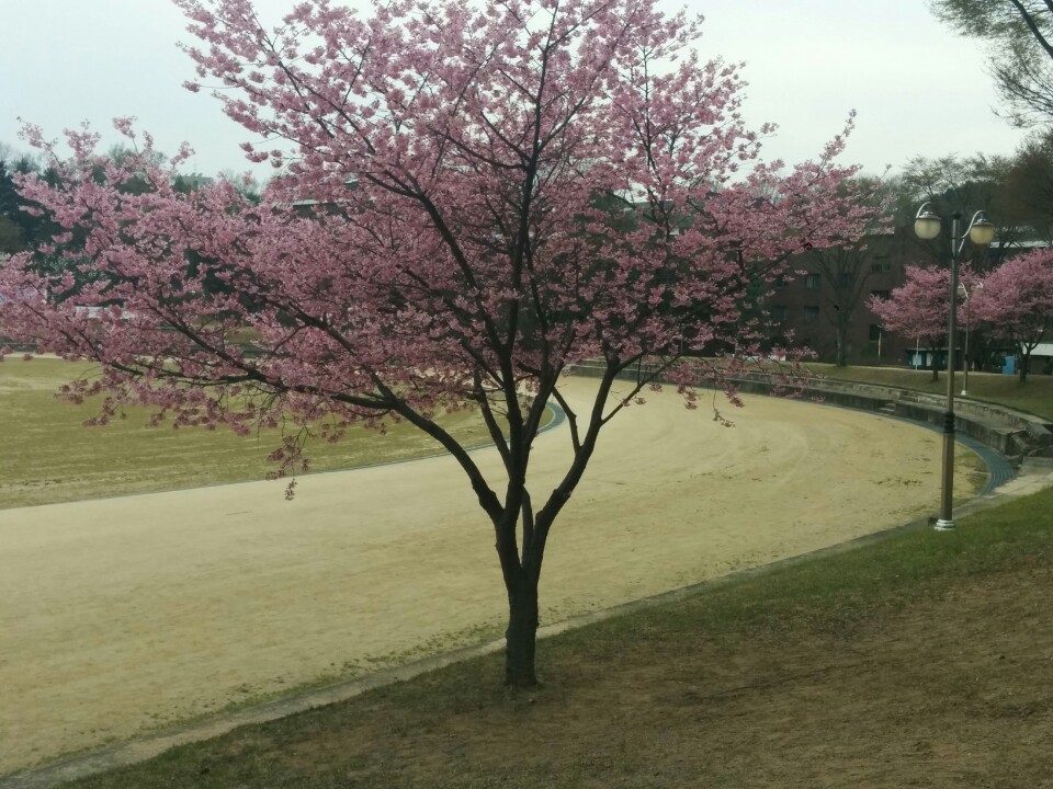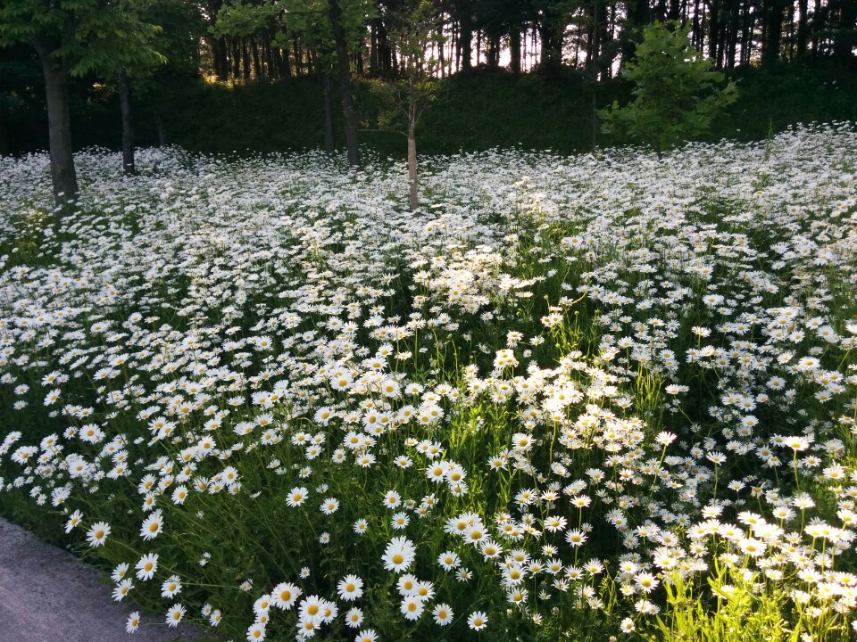 There are so many trees in our campus, so I have never heard of Nut Pine Road. But, it is fantastic with romantic piano sounds emanating from behind Music Building. The bright sunlight shines in through those tall nut pine trees. Oh, there is a pavement over there! I am curious about what beautiful things make me happy. What are those, fried eggs? Ah, it's a Shasta daisy garden! Although I have seen some of them while walking, this is the first time to see a large garden like this. Flowers on both sides of the road are greeting and cheering me up while waving their pretty heads. It should be the best, most wonderful place in KNUE. Ouch! But, wearing sandals was the worst choice.