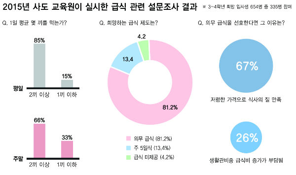 설문조사에는 3, 4학년 희망 입사생 654명 중 335명이 참여하였다. 먼저 사도교육원 식당에서 1일 평균 몇 끼를 먹는지 조사한 결과, 평일엔 ‘3끼 전부’와 ‘2끼만’ 먹는다는 응답이 전체의 85%를 차지했고, 주말엔 66%가 이에 해당했다. 희망 급식 제도로는 ‘의무 급식’이 81.2%, ‘주 5일식’이 13.4% ‘급식 미제공’이 4.2%로 조사됐다. 의무 급식을 선호하는 이유로는 ‘저렴한 가격으로 식사의 질 만족’이 67%, ‘생활관비중 급식비 증가가 부담됨’이 26%에 달했다. 이러한 조사 결과에 따라 기숙사 식당은 현 방침을 유지하기로 했고, 공정거래위원회의 권고에 대해서도 무혐의를 인정받았다.