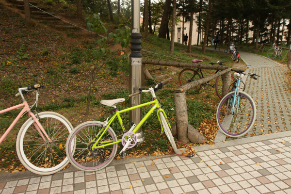 종합교육연수원 건너편, 자취촌으로 내려가는 길목에 놓인 자전거들. 자전거 거치대가 없이 나무 옆에 줄지어 세워져있다.